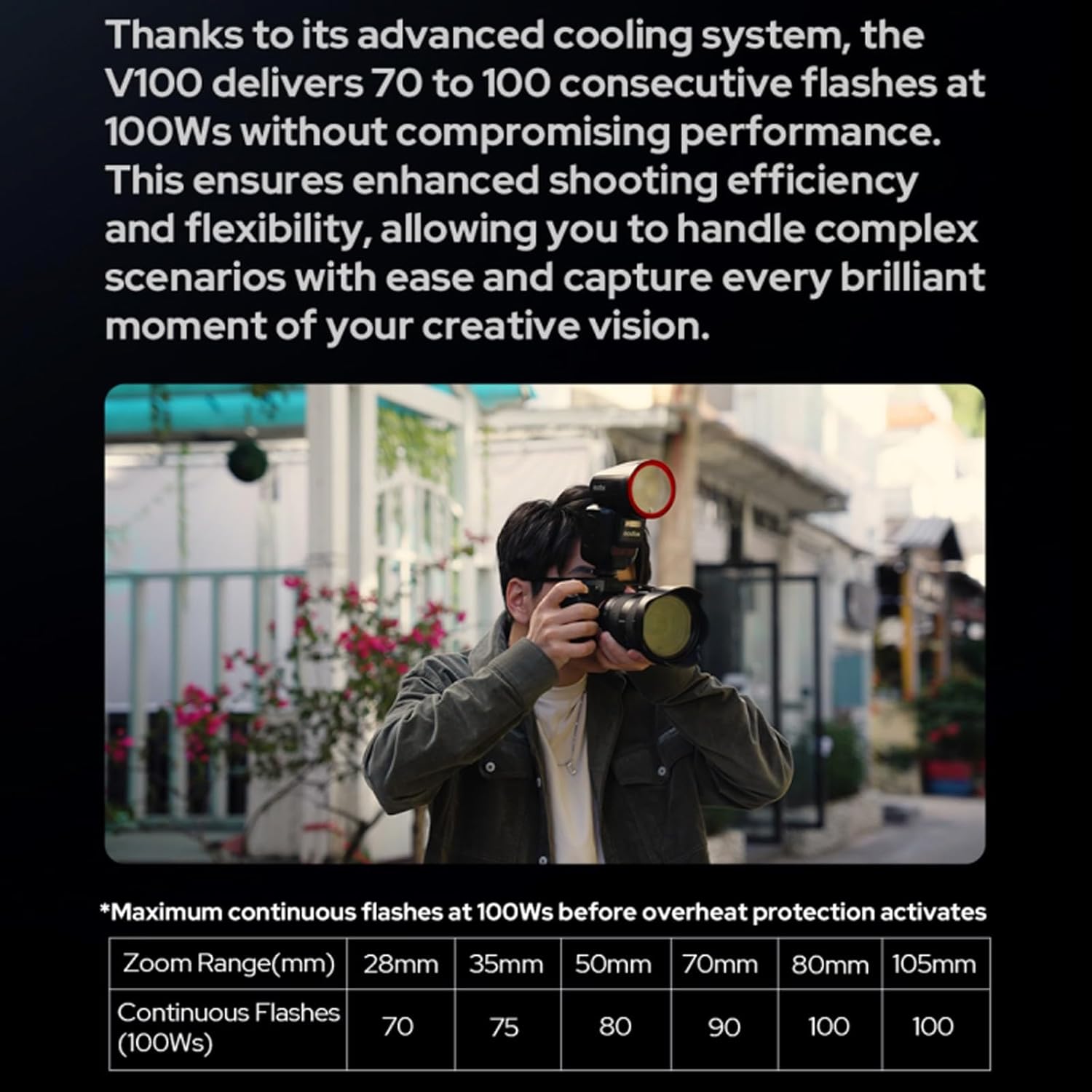 The media could not be loaded. Hey everyone! I’m a real estate and architecture photographer but also do headshots, both indoor and outdoor.Here’s my review of the Godox V100(S)… “S” for Sony. I’m using it primarily with the a7IV and 16-35GM but also with the 24-70GM and 70-200GM.TLDR: I think it’s a great on-camera flash compared to all of the previous versions (of which I own a few) and for a few reasons. Read on for details.First off, the V100s provides 100Ws (Watt Seconds), being a full stop more than other on-camera flashes. This makes it useful for both indoor and outdoor shoots. It’s powered by a high-capacity USB-C charged lithium battery, which is honestly something I’m elated by. No need for a dedicated charger.I love having a very clear touchscreen UI, responsive as my iPhone. I’m not a fan of spinning wheels when I can use a feather light touch and avoid moving my camera in between shots. I also love using the integer power system rather than the fractional system. It’s much easier for me to remember integers than it is to remember fractions.One of the things I love is it’s also a wireless master trigger. This means I can use it as my primary trigger or as a backup for the X3… when the X3 eventually runs out of its internal battery. I personally find myself charging the X3 half way between shoots just so it doesn’t die on me. Godox, please make an X4 with AA batteries. lolThe TTL actually works! Oh. My. Gawd. I’ve never had a flash that provided accurate power in TTL mode. Admittedly, I’ve only had Godox flashes, so this is one reason I’m excited for the new lineup.Color accuracy is great at all powers, very little change in WB across the range.Lastly, I love this flash. It’s the best on-camera flash I’ve ever had. But there are a few potential improvements that could make it even better:* Lack of ⅓ Stop Increments: I imagine this will be resolved in a future firmware update. It’s a glaring omission, especially since the X3 has a setting to change to 10th increments or ⅓ stop increments..* No Physical Switch or Way to Pause From The Standalone Control Page. I often need to turn off my flash to get ambient frames. With Sony cameras there’s no custom button to disable the flash in MASP modes. There’s no physical switch to easily toggle, only a button that needs to be held for 3 seconds. And, the main power setting cannot be long pressed to pause the flash like it can be when used in the transmitter/controller mode.* Lighter Weight Design: This thing is a beast. It’s huge on top of my camera… and heavy. With great power comes great respons-a-lack-of-agility.* Improved Firmware Updates: Godox has made leaps and bounds at making firmware updates easier, especially for Mac users like myself. But I still find it confusing with needing a USB-B to USB-C cable or some other trick.* No Bluetooth Remote Control: Oddly it doesn’t have Bluetooth remote control to use with the Godox iOS app. This is a workaround for pausing my flashes when I can’t touch the camera. I’d love if Godox could work with Sony and/or Camranger on some kind of solution to pause the flash(s) remotely.