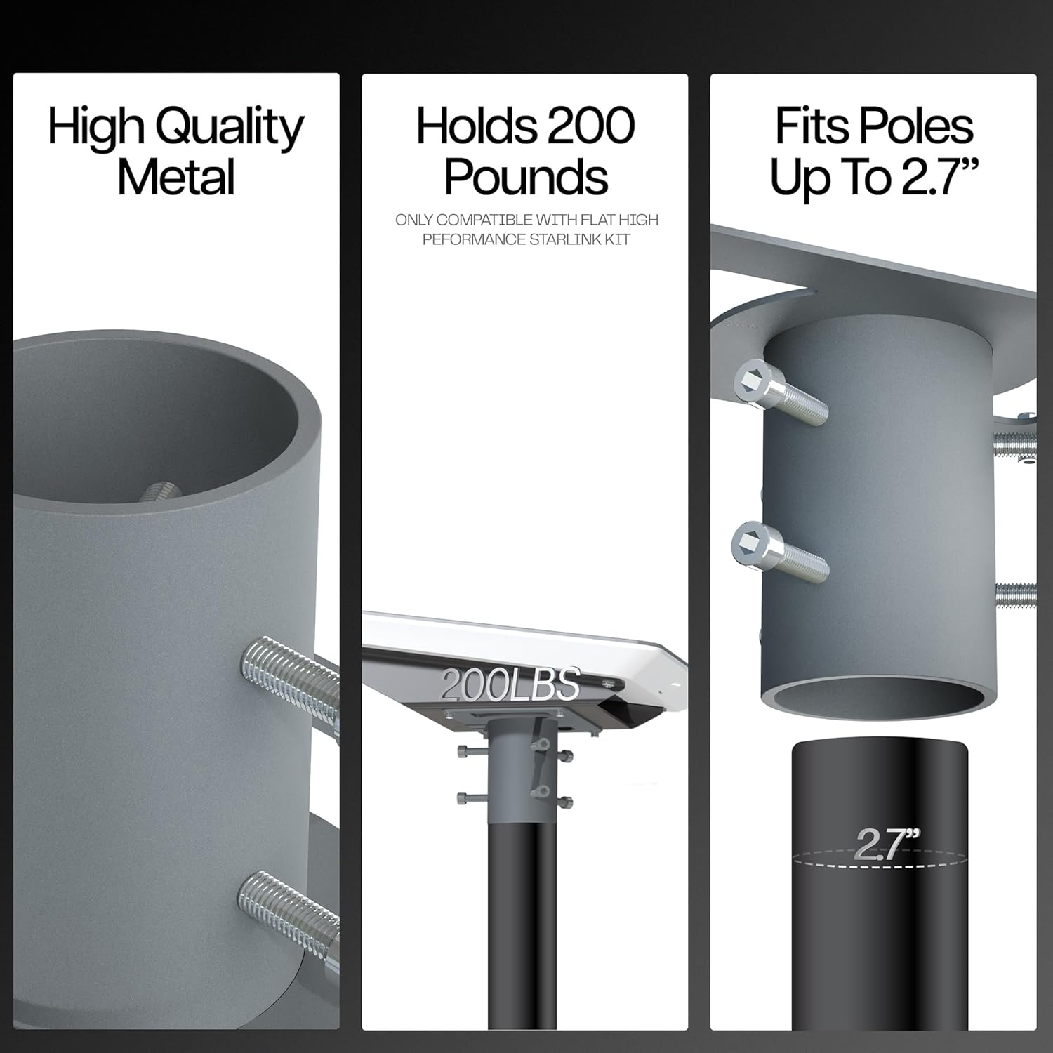 Give the quality and finish of this pole mount, you'd think it was the official one sold by Starlink. First impressions: it's solid, with quality stainless steel hardware and they even made it the right color!I recently got a Starlink Flat Performance dish for my home but I really wanted to pole-mount it up nice and high due to some trees surrounding our home. I thought about making my own mount, but when I discovered this one on Amazon I had to give it a shot because I knew it would be the right fit for the dish and nicer looking that anything I could fabricate myself.Installation is pretty simple: four nuts and bolts clamp the mount to the slide-in mount that is included with your dish. Oh, and did I mention they include the hex wrench and open-ended wrench that you need? No extra tools necessary!Once attached to the dish's base, you simply loosen the six large hex bolts on the sleeve, slide it over your pole, and tighten them up using the included hex wrench.One other functional feature that I like is the opening of the sleeve lines up with the circular opening of the factory mount, so you can route the cable inside the mast / pole instead of letting it simply hang or zip-tying it to the pole.Overall, I'd say this mount is perfect -- certainly great value for the price.