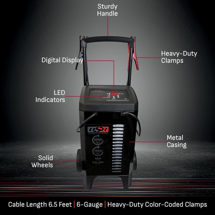 This replaced a charger that I used for decades that died. I’ve only used my new charger once on a 5.4 Triton V8. The battery would only click when trying to start this motor. I set my new charger on 250 amp boost sat down in the drivers seat and the truck started right up with no hesitation. I continued charging the battery and the charger worked great. It’s easy to maneuver around and easy to operate. The LED screen can be hard to read in bright sunlight. That’s the only issue I’ve experienced with this charger. It will work great for home or business uses. The jumper cables and clamps are heavy duty and with plenty of length to reach most any battery.