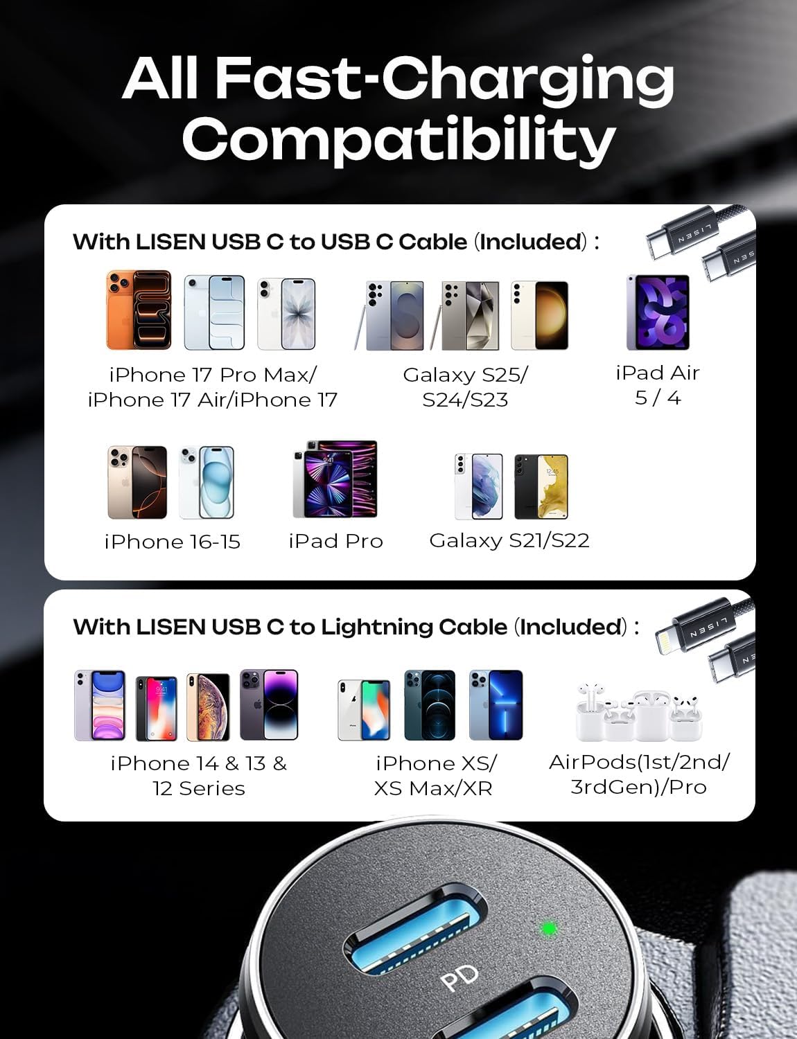 Let's be real, in today's always-on world, a dead phone in the car is practically a nightmare. For me, with an iPhone 16 that's constantly tethered to maps, podcasts, and calls, a reliable car charger isn't a luxury – it's a critical piece of gear. After wading through a sea of flimsy, slow chargers, I finally landed on the LISEN 90W USB C Car Charger, and honestly, it's a revelation.Powerhouse Performance for All My DevicesWhat immediately sold me, and what truly shines in practice, are those dual USB-C ports, each pumping out a hefty 45W with Power Delivery (PD). This isn't just marketing hype; it's genuine, simultaneous fast-charging. I can blast my iPhone 16 from nearly empty and keep my partner's tablet juiced up, all without any noticeable lag. It’s like having two dedicated fast-charge stations in my dashboard. LISEN boasts a 0-80% charge in 30 minutes, and while I haven’t stopwatch-timed it, the speed feels every bit that impressive when I’m racing against the clock.Bundled Cables and Built to LastAnother small but mighty win was the inclusion of both a USB-C to USB-C and a USB-C to Lightning cable. No more frantic searches or forgotten adapters – everything I needed was in the box, ready to roll. And these aren’t just flimsy throw-ins; they feel robust, hinting at a long life of tangled adventures in my car’s console.Speaking of robust, the all-metal construction is a game-changer. I’ve gone through my share of cheap plastic chargers that felt like they’d melt on a hot day or simply snap under pressure. This LISEN charger feels like it could survive a small apocalypse. The metal isn't just for show either; it’s excellent for dissipating heat, giving me peace of mind that it’s not overheating, even during those long drives when every port is working overtime.Sleek Design, Zero FussFinally, the design. It's incredibly compact – practically thumb-sized. It slips into the cigarette lighter socket without being an unsightly eyesore or getting in the way of other controls. It's discreet, effective, and the subtle LED light is just enough to guide my hand in the dark without being a distracting beacon.In short, the LISEN 90W USB C Car Charger isn't just another gadget; it's become an indispensable part of my daily drive. It’s powerful, incredibly well-built, and takes the stress out of keeping all my essential devices charged. If you're serious about staying powered up on the road, especially with a new iPhone or other USB-C hungry devices, do yourself a favor and pick this one up. You won't regret it.