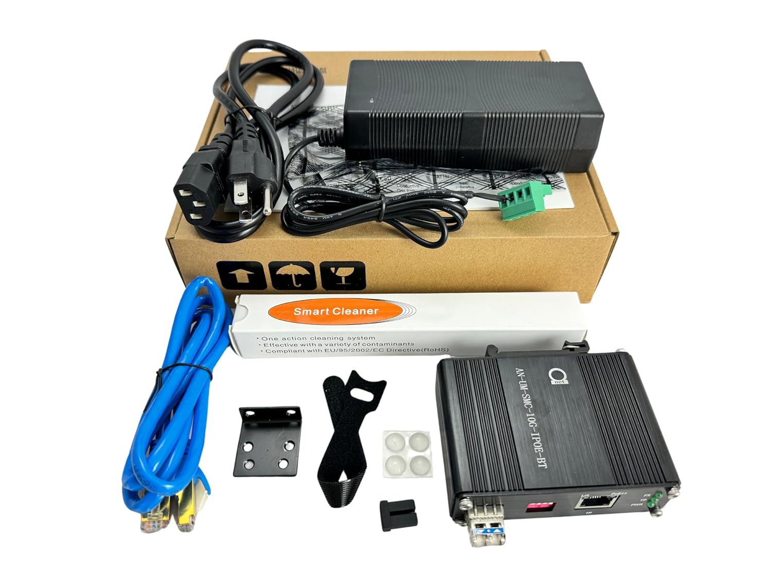 High quality, industrial quality. At this level, you usually have to use a power rail or make you own power cord. Surprise! this comes with the power brick. Now if only it was a linear power supply rather than a switching one, but no matter, it's good to get a power supply with it. You also get the SFP module and even a fiber cleaner. This is the whole thing, except cable, and it works great. Good stuff!