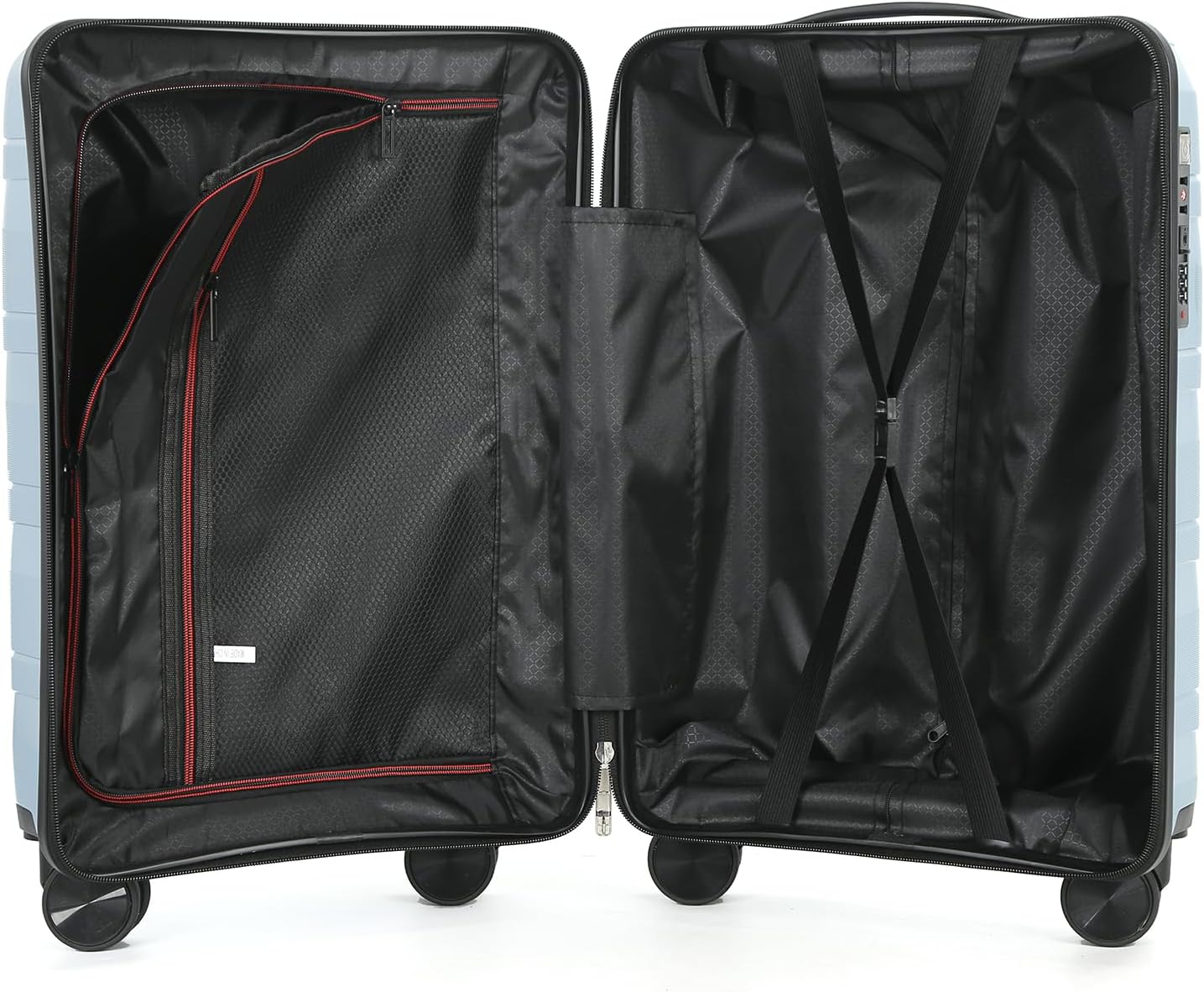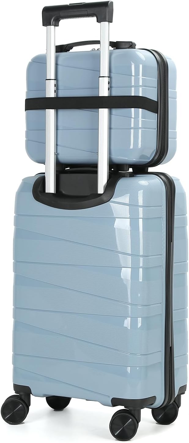 I recently received this 2-piece black polypropylene hardshell luggage set (21-inch carry-on and 14-inch personal item/cosmetic case), and I'm really impressed with how feather-light it is compared to my old suitcase. It's easily half the weight, which makes lifting it into overhead bins or rushing through the airport a breeze—no more straining my back!The 360-degree double spinner wheels are fantastic: silent, smooth, and incredibly maneuverable. The suitcase glides effortlessly in any direction, even on crowded airport floors or uneven sidewalks. I love that it's made from polypropylene material, which is one of the lightest and most flexible plastics used for hardshell luggage—it absorbs impacts well without cracking, bounces back from bumps, and the textured finish hides minor scuffs effectively while keeping the overall weight down.The telescoping handle adjusts smoothly to two heights and has a comfortable ergonomic grip, while the side and top handles are solid and easy to grab. The smaller 14-inch toiletry bag is a great bonus—it even includes a convenient six-piece travel container set, perfect for organizing toiletries or as an under-seat personal item.The 3-digit combination lock is straightforward: simply push the zipper pulls firmly into the slots (they snap in securely), and use the side release button to open it once unlocked. The lock mechanism does protrude a bit more than on some other bags, so I'd be cautious about checking this as baggage—rough handling could potentially damage it.Overall, if you're looking for an ultra-lightweight carry-on set with great mobility and moderate durability (ideal for frequent flyers who mostly carry on), this is an excellent choice. The polypropylene construction keeps it light and flexible without feeling cheap. Highly recommend for domestic travel!