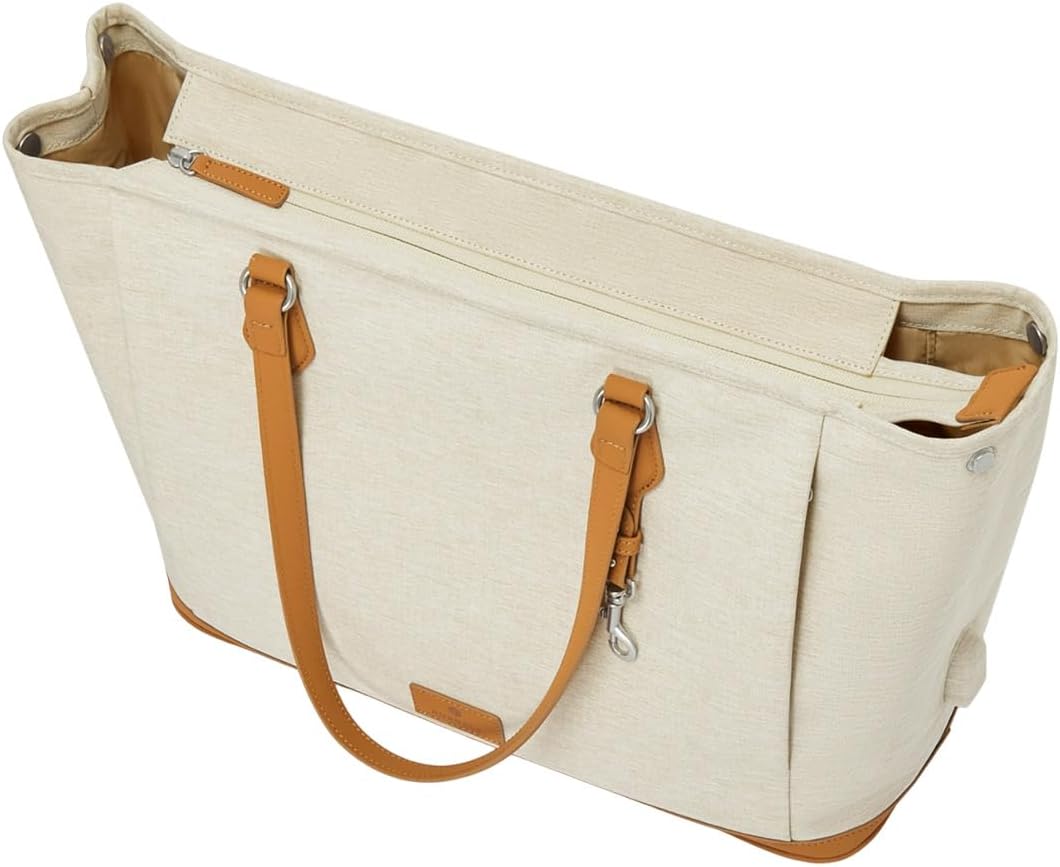 This is the BEST travel tote I have ever had! I am in love with this gorgeous, sturdy, stylish travel bag! It’s big enough to carry lots of stuff, including a laptop. It has loads of pockets to help you stay organized. The fabric is durable and strong and the look is classy and elegant, vaguely like a Hermes Garden Party bag with the expandable snaps! I love that it opens wide and it fits over the handle of my carry on. I wish the handles were leather, but they seem durable enough and they look nice.